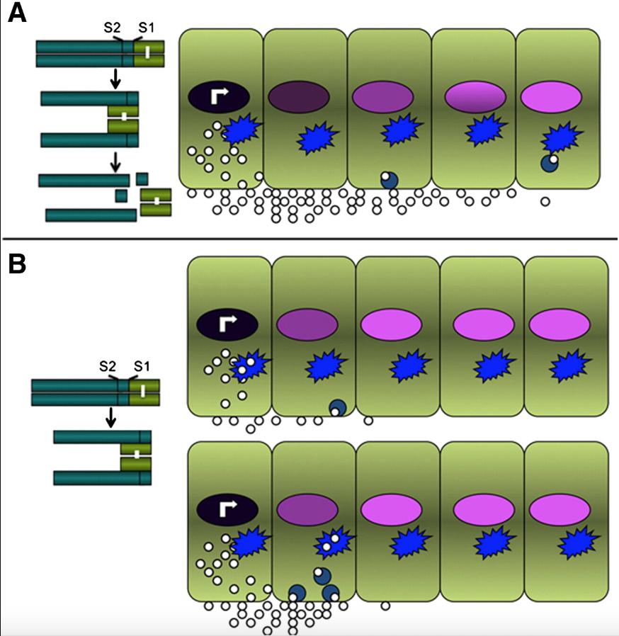 Fig. 1. Model for regulation of BMP4 signaling by sequential cleavage. (A) When proBMP4 is sequentially cleaved at the S1 and then the S2 sites, the mature ligand is released from the cleaved prodomain and is relatively stable, enabling it to signal to distal cells. (B) When proBMP4 is cleaved at the S1 site alone, the mature ligand remains non-covalently associated with the prodomain and this complex is targeted for degradation in the lysosome (blue shape) either directly within the biosynthetic pathway of synthesizing cells (upper panel) or via endocytic targeting in signal receiving cells (lower panel). This lowers the rate of ligand production at the source and/or enhances the rate of ligand degradation in receiving cells. As a result, BMP4 generated by cleavage at the S1 site alone signals is present at lower steady state levels.