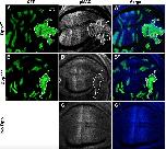 Fig. S3. Dpp generated from proDPPS2KK can induce localized overgrowth of the wing disc when clones abut the periphery. Autofluorescence (A,B) and GFP imaging (Aâ²,Bâ²) of wing discs with large clones of cells (marked by GFP) expressing proDppS2KK. Arrows indicate the borders of the expanded region of the wing disc induced by ectopic Dpp. In (B), overgrowth is also apparent in the folding pattern of the expanded portion of the disc (small arrowheads) that resembles the normal pattern (large arrowheads).