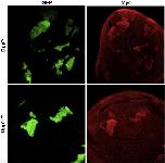 Fig. S4. Immunoreactive Dpp is present in clones of cells expressing wild type and S2KK-mutant precursors. Wing discs with clones of cells (marked by GFP) expressing proDppWT or proDppS2KK were permeabilized and immunostained to detect myc.