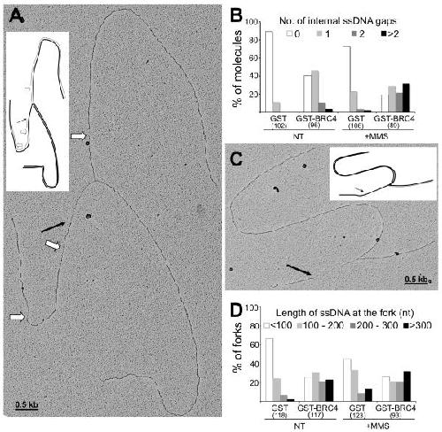 Figure 3. Rad51 is required to prevent replication fork uncoupling and ssDNA accumulation on damaged and undamaged templates. (A) and (C) Electron micrographs (and schematic drawings) of representative RIs isolated from sperm nuclei, incubated in GST-BRC4 treated extracts. Black arrows point to ssDNA regions at the replication fork. White arrows point to ssDNA gaps along the replicated duplexes (internal gaps). (B) Statistical distribution of internal gaps in the analyzed population of molecules. The total number of molecules analyzed is indicated in brackets. (D) Statistical distribution of ssDNA length at replication forks isolated in the indicated conditions. The total number of forks analyzed is indicated in brackets.