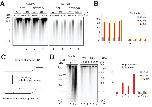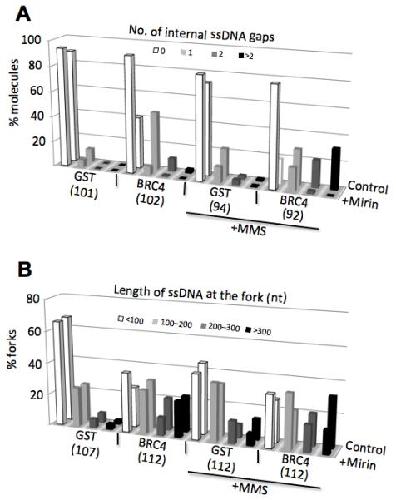 Figure 5. Rad51 protects nascent strand DNA from Mre11-dependent degradation. (A) Statistical distribution of internal gaps in the analyzed population of molecules isolated from extracts that were supplemented with buffer (Control) or 100 μM Mirin and treated as indicated. The total number of molecules analyzed is indicated in brackets. (B) Statistical distribution of ssDNA length at replication forks isolated from extracts that were supplemented with buffer (Control) or 100 μM Mirin and treated as indicated. The total number of molecules analyzed is indicated in brackets. in the indicated conditions.