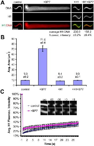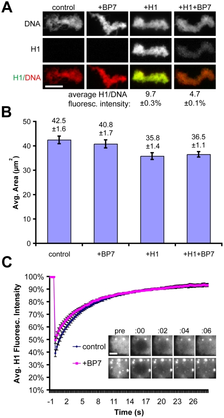 Figure 2. Effects of RanBP7 on H1 in Cytoplasm.(A) Fluorescence images and (B) area quantification of chromatin assembled in extracts with or without 1 µM H1-GFP and 4 µM RanBP7. In cytoplasm, adding RanBP7 does not greatly affect morphology but causes dissociation of H1 as measured by a reduction in fluorescence intensity. Average H1:DNA fluorescence intensity is shown below for conditions supplemented with H1. Scale bar, 10 µm. (C) Average FRAP curves (n≥7) and corresonding timelapse images of H1-GFP on chromatin in cytoplasm. H1-GFP recovers very rapidly and is not greatly affected by the addition of 4 µM recombinant RanBP7. H1-GFP signal was brightened in samples with RanBP7 relative to controls for visualization of the photobleaching and recovery. Photobleach occurs at time = 0. Scale bar, 2 µm. All quantification is shown ± standard error.