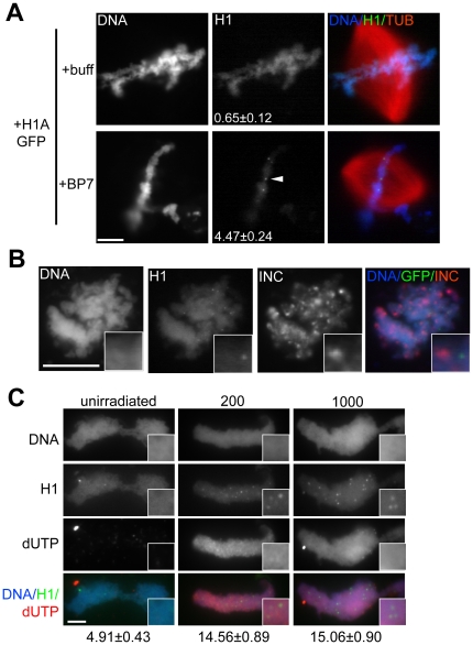 Figure 3. RanBP7 Reveals H1 Foci.(A) Identically-scaled fluorescence images of fixed metaphase spindles from CSF reactions supplemented with 1 µM H1A-GFP and 4 µM RanBP7 or buffer control (+buff). In the presence of RanBP7, H1A-GFP is reduced on chromatin and concentrates on chromatin in small foci (arrowhead). The number of foci per nucleus (average ± standard error, n>40) is shown in the H1A-GFP column. (B) H1A-GFP foci do not colocalize with the centromere marker INCENP (INC). INCENP localization was performed using replicated chromosomes, on which H1A-GFP foci were less obvious but still detectable (insets). (C) Immunofluorescence images of UV-irradiated or unirradiated sperm nuclei assembled into chromatin in metaphase extracts supplemented with H1A-GFP, RanBP7, and biotin-dUTP. Insets are provided and the number of foci per nucleus is shown below the column for each condition. Scale bars, 10 µm.