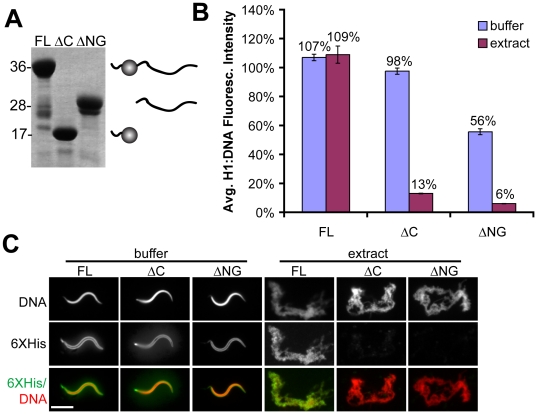 Figure 4. Effect of Cytoplasm on H1M and Domain Truncation Mutants.(A) Coomassie-stained gel of full-length (FL) H1M, amino-globular domains (ΔC), and C-terminal domain (ΔNG), with schematic of the proteins shown at right of the corresponding band. (B) Quantification of H1:DNA fluorescence intensity (average ± standard error) and (C) representative immunofluorescence images of sperm chromatin in buffer or extract supplemented with 1 µM H1M full-length or domains. In extract, full-length H1 localizes as efficiently as it does in buffer, while a sharp drop in localization intensity is observed for the domains. H1 was immunolocalized using the 6XHistidine tag (6XHis) common to all three constructs. For visualization purposes, DNA and H1 signal were brightened in the extract condition relative to buffer. Scale bar, 10 µm.