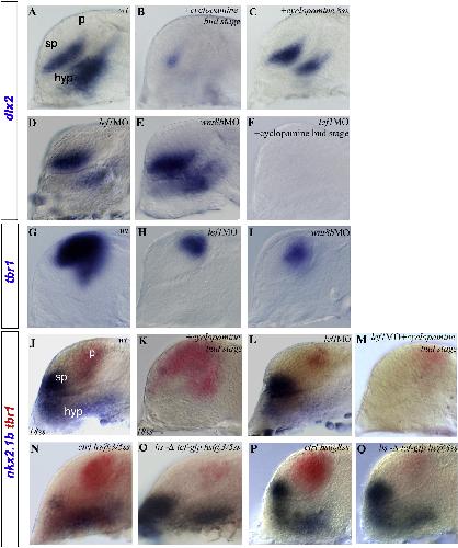 Figure 1. Shh and Wnt Signaling Activities Independently Regulate the Establishment of the Dorsoventral Axis in the Telencephalon(AâQ) Here, as in all subsequent panels, embryos are shown in lateral view, with anterior oriented toward the left and dorsal oriented toward the top unless stated otherwise. Treatments and/or MO injected in embryos are indicated in the top right corners. Embryos are at the 22ss, except when stated otherwise (bottom left of the picture). Expression of (AâF) dlx2 and (JâQ) nkx2.1b (blue) and of (GâI and JâQ) tbr1 (red and blue) in (A, G, J, N, and P) WT/control, cyclopamine-treated embryos at the (B and K) bud or the (C) 8ss, (D, H, and L) the lef1 morphant, the (E and I) wnt8b morphant, (F and M) lef1 morphants treated with cyclopamine at the bud stage, and hs-δtcf-gfp transgenic embryos heat shocked at the (O) 3ss and the (Q) 8ss embryos. hyp, hypothalamus; sp, subpallium; p, pallium.