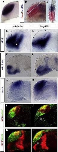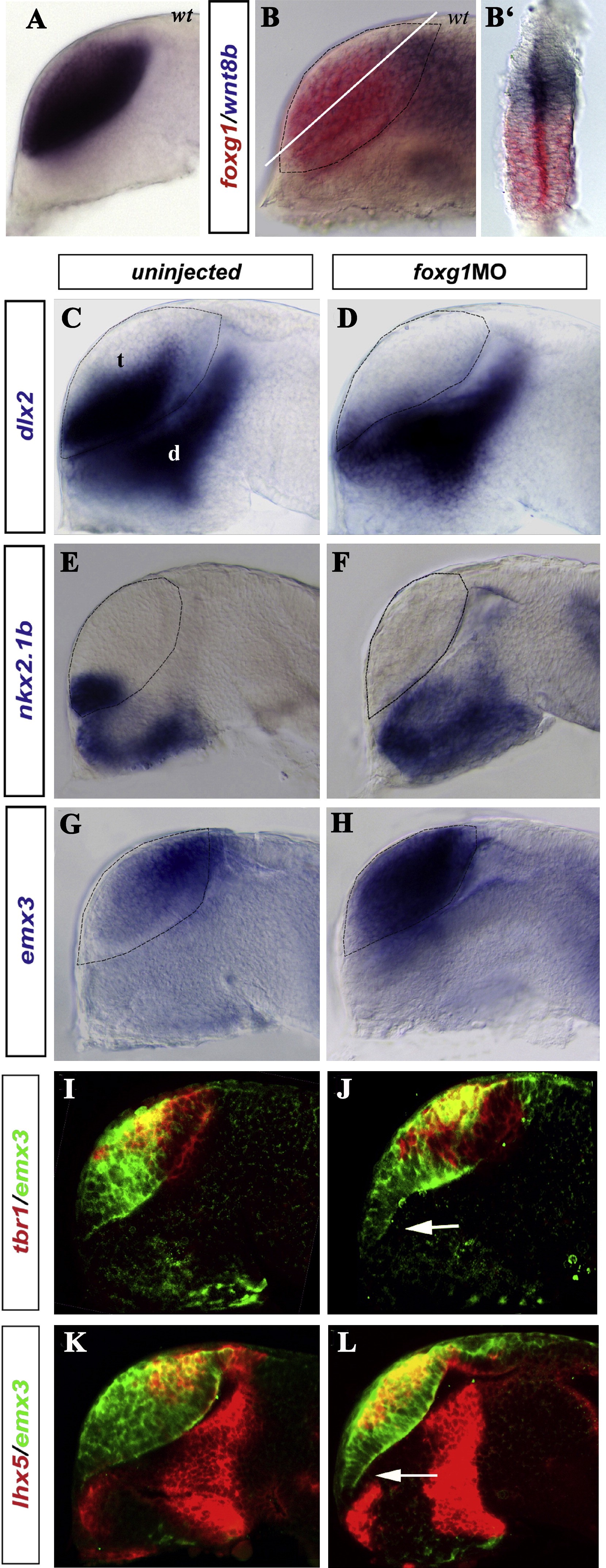 Figure 2. Foxg1 Is Required for the Development of Subpallial Progenitors and Restriction of Pallial Character(AâL) Here, and subsequently, embryos are prim-5 unless stated otherwise at the bottom left of the picture. (AâBâ²) foxg1 expression (blue in [A], red in [B] and [Bâ²]) (A) alone or (B and Bâ²) compared to wnt8b (blue). (Bâ²) Transverse section along the DV axis (white line in [B]). (CâL) Gene expression (on the left of each row) in controls (left column) or in foxg1 morphants (right column). (IâL) GFP staining (green) in a Tg(emx3:YFP) line, coupled with (I and J) tbr1 or (K and L) lhx5 in red. The dotted line indicates the telencephalic border. The arrow in (J) and (L) indicates abnormal morphology of the baso-alar border. t, telencephalon; d, diencephalon.
