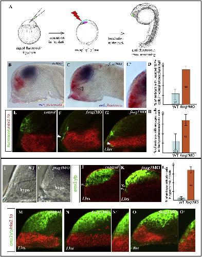 Figure 3. Prospective Subpallial Precursors Adopt the Pallial Fate or Move into Basal Territory in foxg1 Morphants(AâH) Uncaging experiments. (A) Schematic of the experimental procedure. The telencephalic anlage is indicated in bright blue, and the hypothalamus is indicated in pink. Fluorescein uncaged cells in (B and E) control or (C, F, and G) foxg1MO embryos are detected (in red in [B] and [C] or in green in [E]â[G]) in parallel to (B and C) tbr1 (blue) or (EâG) nkx2.1a (red, confocal sections). The quantification of fluorescein+ cells coexpressing tbr1 in the ventraltelencephalon in control or foxg1 morphants with standard deviation is shown in (D). Fluorescein+ cells in the hypothalamus/optic stalk region (arrowheads) are quantified in (H).(I and Iâ²) Close-up of the rostral forebrain by using Nomarski optic in (I) control and (Iâ²) foxg1 morphant embryos.(JâOâ²) Confocal sections of (MâOâ²) Tg(emx3:YFP) with YFP in green and nkx2.1a in red, in (J and M) control, or (K, N, and O) foxg1MO embryos. (L) Quantification of YFP+ cells in the hypothalamic domain.