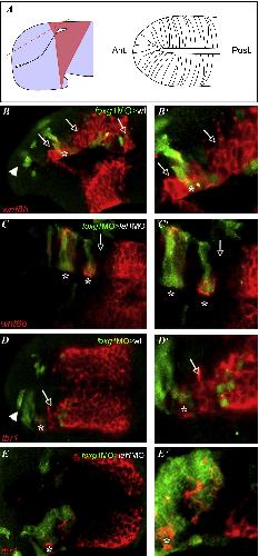 Figure 6. Foxg1 Loss of Function Acts Cell Autonomously and Nonautonomously for the Restriction of Pallial Identity(AâEâ²) All embryos are at the 20ss. All panels show telencephalic dorsal views; anterior is oriented toward the left. The right column shows high magnification of the images on the left. (A) Schematic explaining the plan of section of the confocal images below. The normal wnt8b expression domain is pale red. (BâE) Confocal images of mosaic embryos with transplanted foxg1MO cells in green and (BâCâ²) wnt8b or (DâEâ²) tbr1 expression in red. Asterisks indicate foxg1MO cells, and arrows show neighboring host cells. Host embryos are (B, Bâ², D, and Dâ²) WT or (C, Câ², E, and Eâ²) lef1 morphants. The arrowhead in (B) and (D) indicates the foxg1MO cells located in the ventraltelencephalon.