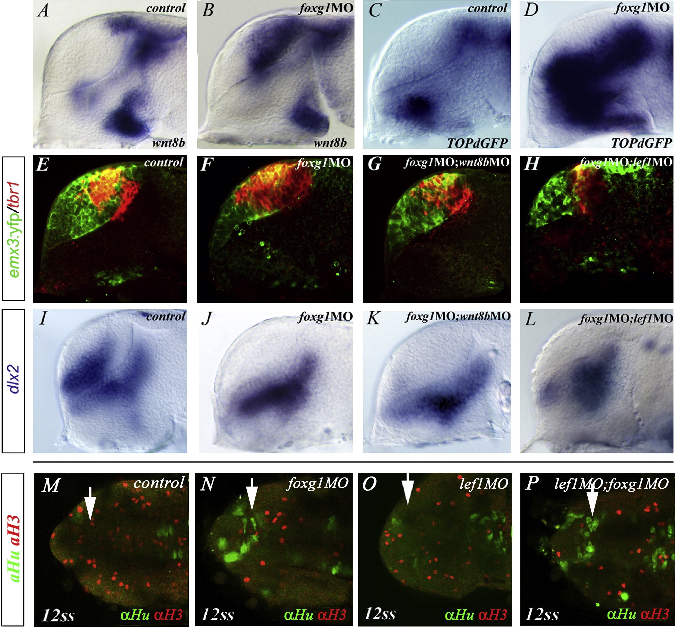 Figure 5. Upregulation of Wnt/β-Catenin Signaling Activity Controls the Expansion of Pallial Fates in foxg1 Morphants(AâL) (A and B) wnt8b and (C and D) topdGFP expression in (A and C) control or (B and D) foxg1MO embryos. Expression of tbr1 (red) and YFP (green) in (EâH) Tg(emx3:YFP) or (IâL) dlx2 , in embryos injected with (F and J) foxg1MO alone or in (G and K) combination with wnt8bMO or (H and L) lef1MO.(MâP) Dorsal views (anterior is oriented toward the left) showing confocal images of double immunostaining of the mitotic marker phosphorylated H3 (red) and the postmitotic neuronal marker HuC (green) in (M) WT, (N) foxg1MO, (O) lef1MO, or (P) foxg1MO;lef1MO double morphants.