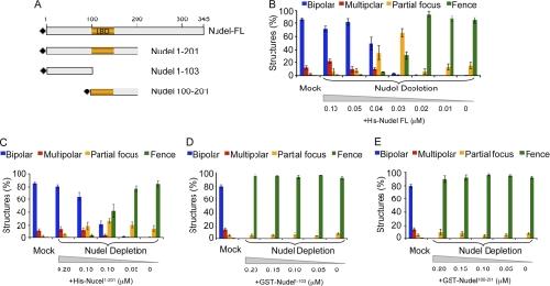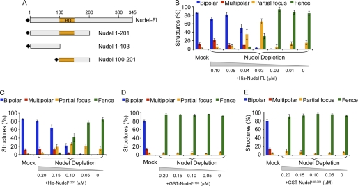 FIGURE 2. The N-terminal coiled-coil domain of Nudel is sufficient for spindle pole organization when provided at 2–4-fold molar excess of the endogenous Nudel/NudE. A, shown are schematic diagrams of Nudel full-length (FL) and fragments. Xenopus Nudel is 345 amino acids long with the Lis1 binding domain (LBD) localized between amino acids 100 and 153. All depicted Nudel proteins are tagged at their N termini with either GST or His (black diamonds). B, full-length His-Nudel rescues the spindle pole defects caused by Nudel/NudE depletion when added at equal or greater than 0.05 μm, which is similar to the estimated endogenous Nudel concentration (0.05–0.1 μm (10)). C, the N-terminal fragment containing the first 201 amino acids of Nudel can fully rescue the spindle pole defects caused by Nudel/NudE depletion when added at 0.2 μm, which is 2–4-fold higher than the endogenous Nudel/NudE concentration. Both His and GST-tagged Nudel1–201 exhibit equivalent activities in this assay. Shown are quantifications for His-Nudel1–201. D and E, the complete coiled-coil domain is required for spindle pole focusing. Neither the first 100 amino acids of Nudel that do not contain the Lis1 binding domain nor the second 100 amino acids of Nudel that contain the Lis1 binding domain can rescue spindle pole defects caused by Nudel/NudE depletion. Error bars, S.E.