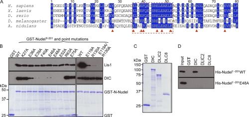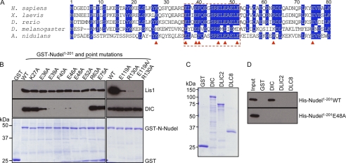 FIGURE 4. Nudel directly interacts with the dynein intermediate chain. A, shown is sequence alignment of the N-terminal 80 amino acids of Nudel from different organisms (numbers are for Xenopus Nudel). Amino acids mutated to alanine are indicated by red arrowheads. The highly conserved region is outlined by a red dashed square. B, highly conserved amino acids in Nudel mediate dynein binding. The highly conserved amino acids as indicated in A are mutated to alanines in GST-Nudel1–201. Point mutations of conserved amino acids greatly reduced dynein binding without affecting Lis1 binding. Point mutations in the Lis1 binding domain diminishes Lis1 binding without affecting dynein binding. C, shown is SDS-PAGE of purified GST, DIC, DLIC2, and DLC8 stained by Coomassie Blue. D, Nudel directly binds to DIC. Purified His-Nudel1–201, but not purified His-Nudel1–201E48A, binds purified DIC.