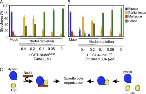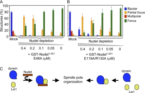 FIGURE 5. The N-terminal dynein and Lis1 binding domains are both essential for spindle pole organization. A, the GST-Nudel1–201E48A that does not bind to DIC fails to rescue spindle pole defects caused by Nudel/NudE depletion. B, the GST-Nudel1–201E119A/R130A that fails to bind to Lis1 also does not rescue spindle pole defects. C, shown is a model depicting how Nudel functions to regulate dynein through Lis1. Nudel functions as a bridge to facilitate Lis1 and dynein interaction. Without Nudel, an increase of Lis1 concentration is sufficient to promote Lis1 and dynein interaction for spindle pole organization. Error bars, S.E.