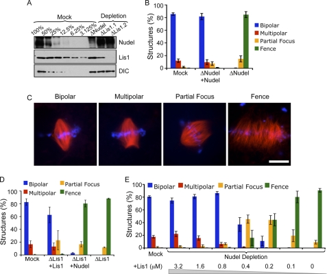 FIGURE 1. Nudel functions to stimulate spindle pole focusing through Lis1. A, immuno-depletion of Nudel from egg extracts is shown. One round of immuno-depletion is sufficient to remove most of Nudel/NudE in Xenopus egg extracts, whereas two rounds of immuno-depletions (ΔLis1.1 and ΔLis1.2) routinely remove ∼90% of Lis1 in egg extracts. Neither Nudel/NudE nor Lis1 depletion reduced the level of dynein as judged by Western blotting probing for the DIC. Control IgG-depleted egg extracts (Mock) were loaded at the indicated amount to assess the degree of immuno-depletion. B, spindle pole defects caused by Nudel/NudE depletion is fully rescued by adding purified Nudel protein. Immuno-depletion of Nudel resulted in the formation of mostly fence-like microtubules aligned perpendicularly across the sperm chromatin and a small fraction of spindles with multiple or partially focused poles (see the images in C), which can be fully rescued by addition of 50 nm concentrations of purified His-Nudel full-length protein. C, shown are representative images of spindles that are defined as bipolar, multipolar, partially focused, or parallel array of microtubules appearing as fence-like structure (Fence) perpendicular to the condensed chromatin. D, depletion of Lis1 caused a similar spindle pole defects as Nudel/NudE depletion. These defects could be rescued by adding 1 μm purified His-Lis1 but not by 1 μm His-Nudel. E, purified His-Lis1 fully rescues Nudel/NudE depletion. The addition of increasing concentrations of purified His-Lis1 shows that equal or greater than 0.8 μm His-Lis1 (the endogenous Lis1 is estimated at ∼1 μm, see supplemental Fig. S1) is sufficient to fully rescue the spindle pole defects caused by Nudel/NudE depletion. Error bar, S.E. Scale bars, 20 μm.