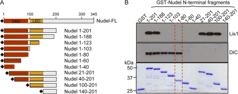 FIGURE 3. Identification of a dynein binding domain in the N terminus of Nudel. A, schematic diagram of Xenopus Nudel with deletion series from either N- or C terminus is shown. DBD, dynein binding domain. LBD, Lis1 binding domain. All proteins were tagged by GST (black diamonds). B, the purified GST-tagged Nudel fragments and their ability to interact with either dynein or Lis1 in Xenopus egg extracts is shown. Purified GST was used as controls. The minimal dynein binding region was mapped to the first 80 amino acids (1–80 as indicated by a red dashed square). As expected the minimal Lis1 binding domain is mapped to amino acids 100–153 of Nudel.