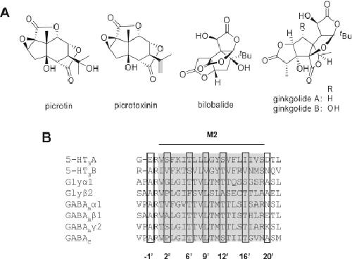 Fig. 1. Structures of the compounds used in this study (Panel A), and an alignment of human Cys-loop receptor M2 regions (Panel B). The alignment includes the human 5-HT3 receptor A and B subunits in addition to subunits from other Cys-loop receptors that are inhibited by BB, GB and PTX. M2 residues are usually referred to using prime (′) notation, which is shown below the alignment. Accession numbers for the alignment are: 5-HT3A (P46098), 5-HT3B (O95264), glycine α1 (P23415), glycine β2 (P48167), GABAA α1 (P14867), GABAA β1 (P18505), GABAA γ2 (Q8N1C3).