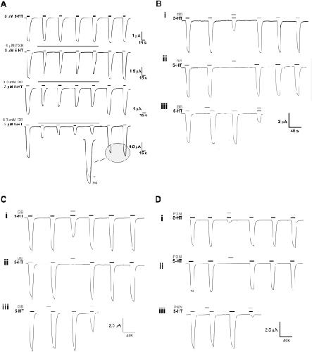Fig. 3. Evidence for channel block. A: The use-dependency observed for GB was absent for BB and PXN. For GB, the percentage inhibition measure at peak (31 ± 3.1%) was less than that measured during the first application (38 ± 0.8%). For GB, full recovery was not seen until a second application of GB was applied (inset); at 0.3 mM GB, the first 5-HT response was 91 ± 2% of the second 5-HT response. B–D: The inhibition observed following the co-application (i) of each compound was not seen if the same compound was pre-applied before 5-HT (ii and iii). When compounds were pre-applied immediately before 5-HT (iii), no reduction in the 5-HT response was noted. 5-HT = 2 μM. BB = 1 mM, GB = 300 μM, PXN = 30 μM. For each compound, traces are representative of >5 experiments on ≥2 batches of oocytes.