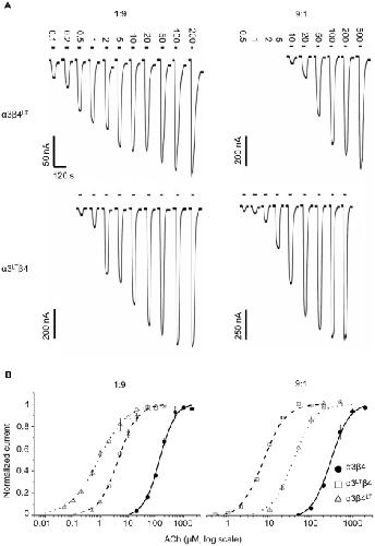 Figure 2. The effect of the 9′ LT mutation in oocytes depends on the α3∶β4 subunit ratio.Traces in (A) represent inward currents elicited by different concentrations of ACh (in µM) bath applied (duration shown as a solid bar). Cells were held at −70 mV. Pooled normalised dose-response curves, fitted with the Hill equation with free parameters are shown in (B) for oocytes injected with 1∶9 (left) or 9∶1 (right) α3 to β4 cRNA ratio. The 1∶9 subunit ratio produces wild-type receptors that are more sensitive to ACh. The effect of the mutation is greater when it is carried by the β4 subunit if β4 is overexpressed (1∶9) and when the α3 subunit is mutated if the α3 subunit is overexpressed (9∶1).