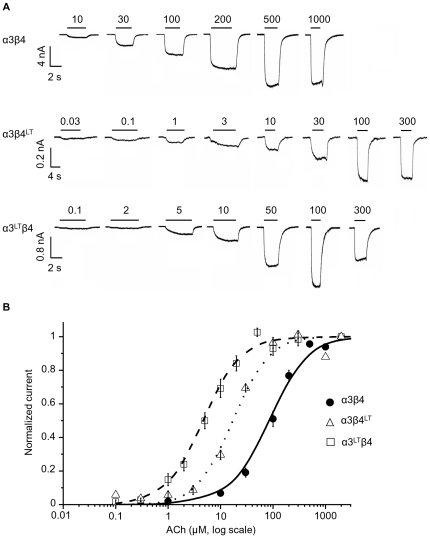 Figure 1. In HEK-expressed α3β4 receptors, the 9′LT mutation has a greater effect if inserted in α3.Traces in (A) are whole cell inward currents elicited by different ACh concentrations applied to cells expressing wild type (top), α3β4LT (middle) or α3LTβ4 (bottom) channels. The bars above the traces show the duration of the agonist applications and the agonist concentration (in µM). Cells were transfected with an α3 to β4 ratio of 1∶1 and held at −30 mV. Dose-response curves are shown in (B) for each receptor combination. The data were averaged after normalisation to the fitted maximum for each experiment. The lines show Hill equation fits (see Methods) to the pooled normalised data (n = 6–8).