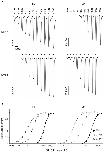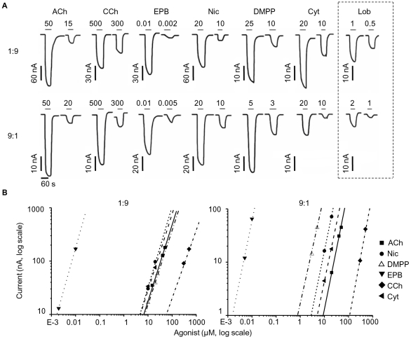 Figure 4. The two different receptor stoichiometries expressed in oocytes differ in their DMPP sensitivity.The traces in (A) are examples of inward currents elicited by low agonist concentrations (in µM) and recorded from oocytes injected with a subunit ratio of 1∶9 (top traces) and 9∶1 (bottom). The duration of each agonist application is shown above each trace (solid bar). All agonists (CCh, carbachol; EPB epibatidine; Nic, nicotine; DMPP, dimethylphenylpiperazinium; Cyt, cytisine; LOB, lobeline) were tested on the same oocyte (held at −70 mV), with the exception of lobeline (shown on the right, recorded from a different cell but with similar initial ACh current as the cell on the left, for both subunit ratios). The log-log plots in (B) are partial dose-response curves for the experiments shown in A (left). Note the increase in the potency of DMPP (10-fold leftward shift of the dose-response curve) in the 9∶1 ratio.