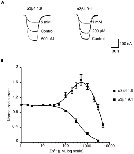 Figure 5. The two-α and three-α form of the α3β4 receptor differ in their response to Zn2+ modulation.Traces in (A) are typical currents activated by an EC20 concentration of ACh on the two-α receptor (left, 1∶9 α∶β ratio) and the three-α receptor (right, 9∶1 ratio) in the presence of increasing concentrations of Zn2+. Zn2+ was pre-applied to oocytes for 30 s before it was applied together with ACh. (B) Zn2+ concentration-response curves for the three-α receptor (filled squares) and the two-α receptor (filled circles). Curves from different cells were pooled and fitted to the Hill equation and to the sum of two Hill equations, respectively. Note that Zn2+ potentiated only the ACh responses of oocytes expressing the two-α stoichiometry.