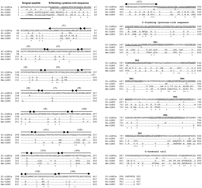 The intestinal epithelium undergoes constant self-renewal throughout adult life across vertebrates. This is accomplished through the proliferation and subsequent differentiation of the adult stem cells. This self-renewal system is established in the so-called postembryonic developmental period in mammals when endogenous thyroid hormone (T3) levels are high. The T3-dependent metamorphosis in anurans like Xenopus laevis resembles the mammalian postembryonic development and offers a unique opportunity to study how the adult stem cells are developed. The tadpole intestine is predominantly a monolayer of larval epithelial cells. During metamorphosis, the larval epithelial cells undergo apoptosis and, concurrently, adult epithelial stem/progenitor cells develop de novo, rapidly proliferate, and then differentiate to establish a trough-crest axis of the epithelial fold, resembling the crypt-villus axis in the adult mammalian intestine. The leucine-rich repeat-containing G protein-coupled receptor 5 (LGR5) is a well-established stem cell marker in the adult mouse intestinal crypt. Here we have cloned and analyzed the spatiotemporal expression profile of LGR5 gene during frog metamorphosis. We show that the two duplicated LGR5 genes in Xenopus laevis and the LGR5 gene in Xenopus tropicalis are highly homologous to the LGR5 in other vertebrates. The expression of LGR5 is induced in the limb, tail, and intestine by T3 during metamorphosis. More importantly, LGR5 mRNA is localized to the developing adult epithelial stem cells of the intestine. These results suggest that LGR5-expressing cells are the stem/progenitor cells of the adult intestine and that LGR5 plays a role in the development and/or maintenance of the adult intestinal stem cells during postembryonic development in vertebrates.