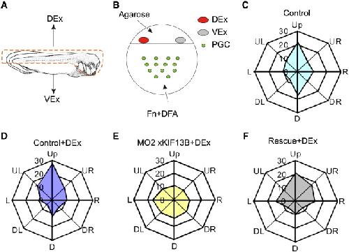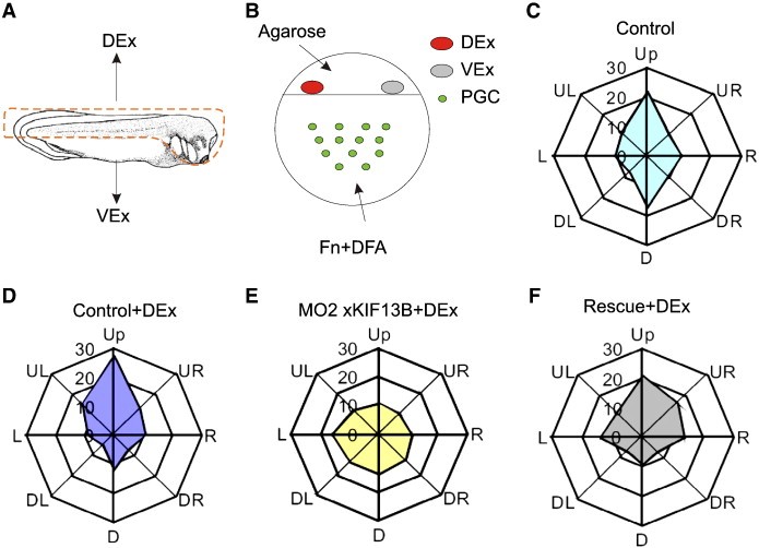 Fig. 5. Protrusion polarity and directional migration of Xenopus PGCs in vitro. (A and B) Graphical representation of the PGC polarity assay. (A) Dissection scheme of a tailbud stage embryo. Dorso-anterior parts as indicated by the dotted line were used for the preparation of the dorsal protein extract (DEx), the remaining portion of the embryo was used either for the PGC isolation or for the preparation of the ventral protein extract (VEx). (B) Schematic illustration of the final set up for the PGC polarity assay (see Materials and methods for details). (CâF) Radar-graphs illustrating directionality of protrusion formation by PGCs cultured in the absence (C) or presence (DâF) of DEx. Cells were isolated from stage 30â31 embryos injected with 0.2 ng of EGFP_GRPIPH_DE mRNA alone (C and D), or co-injected with 16.8 ng of xKIF13B MO2 (E), or co-injected with 16.8 ng of xKIF13B MO2 together with 0.1 ng of the xKIF13B ORF_DE mRNA (F). At least 90 cells each were analyzed in three independent experiments. Other abbreviations: Up â up the gradient. Down â down the gradient. L/R â orthogonally to the gradient (to the left/right). |