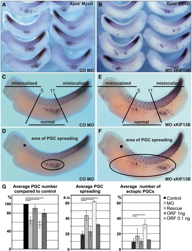 Fig. 2. Knockdown of xKIF13B results in PGC mislocalization. All embryos were stained for Xpat (PGC marker) and MyoD (somite marker). (A and B) Representative examples of embryos injected with 33.6 ng of control MO (A), or with 16.8 ng of xKIF13B M02 (B). Quantifications of the average number of mislocalized PGCs (C and E) and of PGC âspreadingâ (D and F) in control MO (C and D) and xKIF13B MO injected (E and F) embryos (see also Material and methods). (G) xKIF13B loss- and gain-of-function reduces the average PGC number and leads to PGC mislocalization. Control embryos were injected with 33.6 ng of control MO: xKIF13B morphants were injected with 16.8 ng of xKIF13B MO2; rescue was performed by co-injection of 16.8 ng of xKIF13B MO2 and 0.1 ng of the xKIF13B ORF_DE mRNA; for xKIF13B overexpression 0.1 or 1 ng of the xKIF13B ORF_DE mRNA per embryo was injected. For each independent injection 20 embryos per treatment were analyzed. Average PGC numbers were calculated in percentage relative to the control embryos set to 100% for each independent round of injections. PGC spreading represents the minimal ellipse covering the germ cells, normalized to the size of the embryo and represented in arbitrary units (a.u). PGC mislocalization was calculated as percentage of mislocalized (ectopic) PGCs relative to the total PGC number. PGCs were regarded as âmislocalizedâ when positioned beyond somites 5â11 along the A/P axis of an embryo. Results were averaged between at least three independent rounds of injections. Error bars represent the standard deviation of the mean, lines depict p < 0.05. |