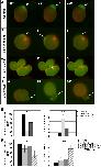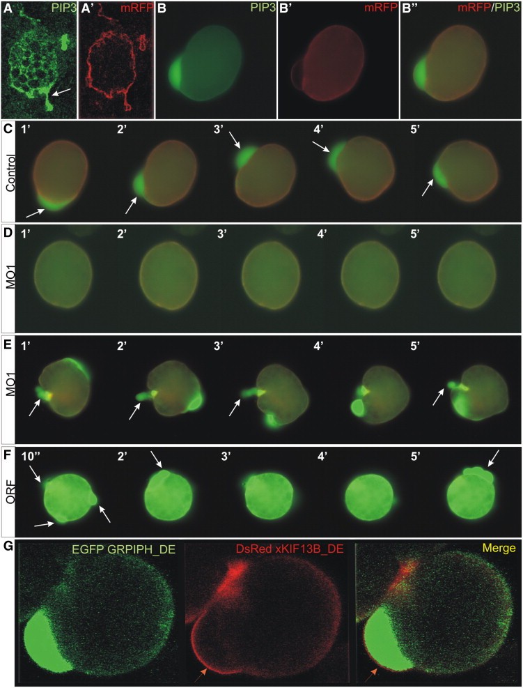 Fig. 3. Modulation of xKIF13B expression affects morphology, dynamics of protrusion forrmation and PIP 3-mediated polarity in isolated PGCs. (A and B) PIP3 is enriched in the protrusions forrmed by PGCs (A and Aâ²) confocal microscopy images of a migrating PGC in a living embryo at stage 31. Images were taken in two channels: GFP to visualize EGFP_GRPIPH_DE reporter protein as a read-out for the PIP3 signal (A) and RFPto visualize farnesylated RFP (mRFP) labeling the cell membrane (Aâ²). The arrow depicts the PIP3 enrichment in the protrusion at the leading edge of the cell. (BâBâ²) Fluorescence microscopy images of a PGC isolated from stage 31â32 embryos. Images were taken in two channels: (B) for GFP, to visualize EGFP_GRPIPH_DE reporter protein as a read-out for the PIP3 signal, (Bâ²) for RFP to visualize farnesylated RFP (mRFP), labeling the cell membrane. The merged image (Bâ²) reveals enrichment of PIP3 in the protrusion. (CâE) Representative examples for membrane dynamics and PIP3 distribution in cultured PGCs upon modulation of xKIF13B activity. PGCs were isolated from embryos that had been injected with 0.2 ng of the EGFP_GRPIPH_DE mRNA alone (C), co-injected with 10 ng of xKIF13B MO1 (D and E), or co-injected with 0.5 ng of the xKIF13B ORF_DE mRNA (F). Images were selected from time-lapse movies taken for 5 mm with a 10 s per frame mode. Arrows indicate PIP3-enriched membrane extensions formed by PGCs. (G) xKIF13B localizes to the membrane of PGC protrusions. 80Ã-snapshots from the confocal time-lapse movie illustrate the intracellular localization of xKIF13B in an isolated PGC on fibronectin. Cells were isolated form tailbud stage embryos co-injected at two-cell stage with 0.2 ng of the EGFP_GRPIPH_DE and 0.3 ng of the dsRed_xKIF13B ORF_DE mRNA. Images were taken in two channels: GFP to visualize the PIP3 signal (left image) and RFP for xKIF13B (middle image). The arrow points to xKIF13B enrichment at the membrane of the PGC protrusion. |
