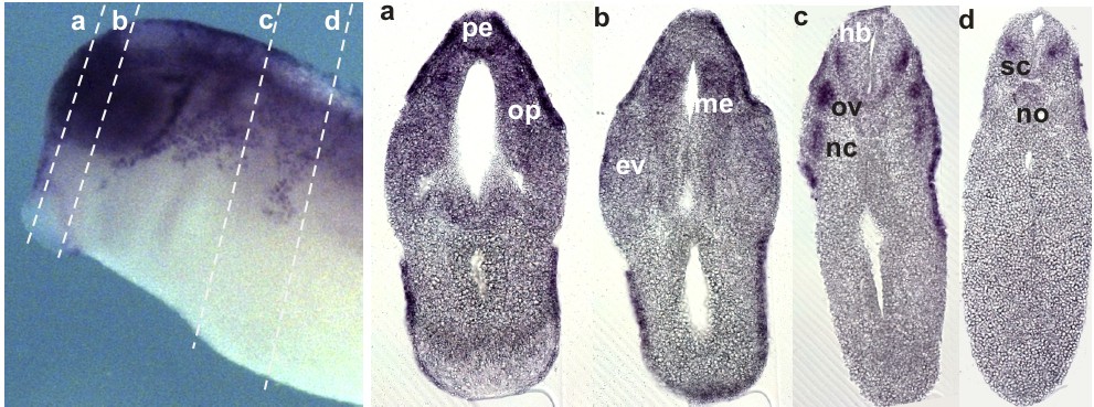 Sppl. Fig 2. xKIF13B expression on the nervous system and migrating neural crest cells at tailbud stage. XKIF13B mRNA was detected by wmish. Dotted lines indictate section palnes shown in (q-d). Abbreviations: pe prosencephalon; op olfactory placode; ev eye vesicle; me mesencephalon; hb hindbrain ; ov otic vesicle; nc neural crest; sc spinal cord; no notochord. |