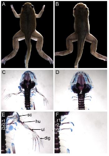Fig. 1. A transgene insertion ablates all forelimb structures. (A) Metamorphosing froglets heterozygous for an Nkx2.5FP transgene show normal forelimb development while (B) homozygous siblings lack forelimbs. (C, E) Skeletal preparation of a wild type froglet showing limb skeletal elements including the scapula (sc), humerus (hu), ulna (ul), and digits (dit); clavicle is hidden beneath the scapula. (D, F) All forelimb skeletal structures, including the scapula and clavicle, are missing in xdm froglets, but the ribs are unaffected (r1, r2, and r3). |
