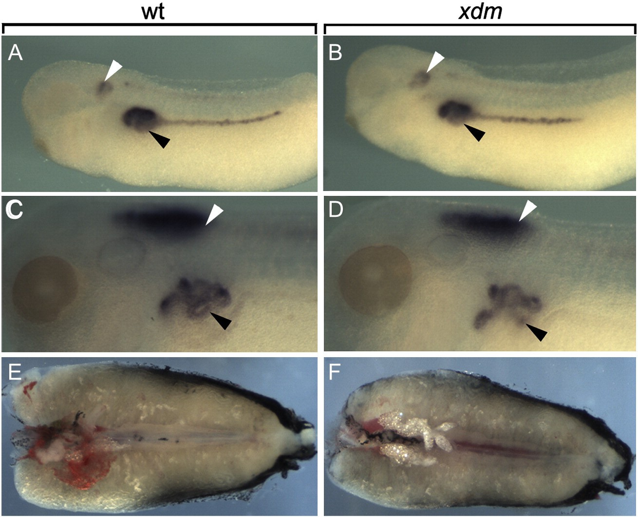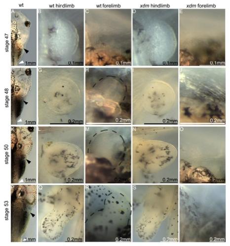 Fig. 2. Forelimb buds do not form in xdm. (A, F, K, P) Dorsal views of stages 47, 48, 50 and 53 wt tadpoles showing sites of the forelimb (black arrowheads) and the hindlimb (white arrowheads). (D, I, N, S) Hindlimb development occurs normally in the mutant compared with the wt (B, G, L, Q). (C, E) Stage 47 wild type and mutant tadpoles immediately prior to forelimb bud initiation. (H) Forelimb buds (dashed outline) first appear at stage 48 in wt tadpoles but not in xdm homozygotes (J). (M) Forelimbs are more distinct in stage 50 wt larvae but are still absent in xdm (O). (R) By stage 53 the wt forelimb has formed a handplate, while mutant tadpoles still lack forelimb buds (T). |