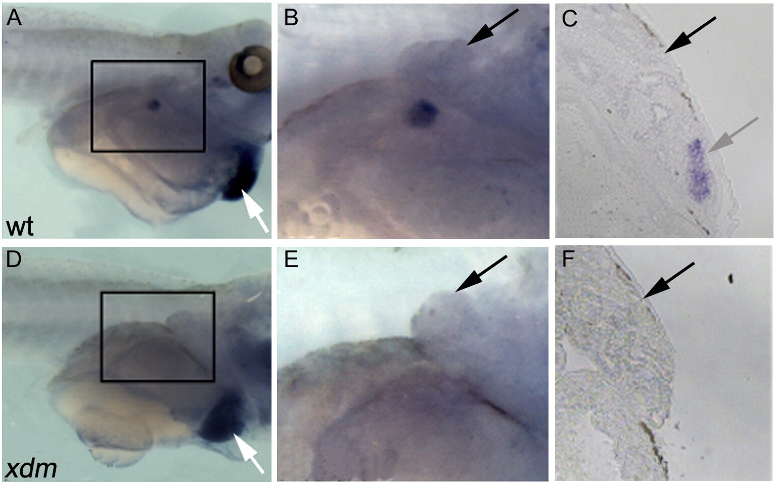 Fig. 5. Xdm mutants fail to express tbx5 in the forelimb-forming region. (AâC) WISH analysis of stage 48 wild type embryos detects tbx5 in the nascent forelimb bud and heart (white arrow). (DâF) Xdm embryos lack tbx5 expression in equivalent flank region. (B, E) Magnified view of boxed regions in (A) and (D) showing pronephros (black arrow). (C) 10Ã view of a transverse section through wild type flank showing tbx5 expression in the nascent forelimb (gray arrow) below the pronephros (black arrow). (F) 10Ã view of a transverse section of xdm at equivalent level of the forelimb region shows pronephros (black arrow) but no tbx5 expression. |