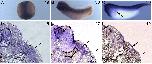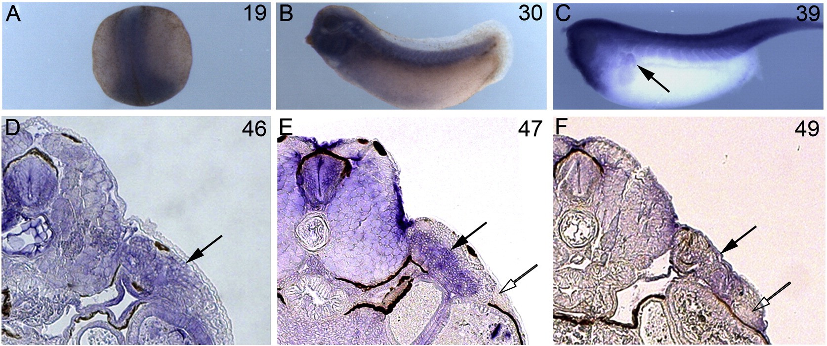 Fig. 6. Npnt is widely expressed during development. (A) Npnt WISH shows strong expression in neural tissue and axial mesoderm in the late neurula (stage 19). (B) Tailbud (stage 30) and tadpole (C, stage 39) express in the head/gill arches, CNS, somites, and pronephros (arrow). (DâF) Transverse sections of npnt WISH at stages 46â49 show broad staining including pronephros (black arrow) but exclusion from the epidermis and the prospective forelimb-forming region (open arrow). |