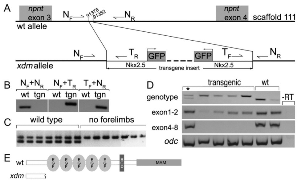 Fig. 3. Xdm maps to a transgene insertion in nephronectin. (A) Schematic showing the wild type npnt genomic locus (above), and the structure of the Nkx2.5FP transgene insertion in the xdm allele (below). Genotyping primers which amplify the wild type npnt allele (NF + NR) and the junctions at each end of the insertion (NR + TR and TF + NR) are indicated. (B) Npnt sequence spanning the insertion can be amplified with npnt primers (NF + NR) from wild type (wt) but not transgenic (tgn) haploid embryos; chimaeric DNA at either end of the insertion can be amplified from transgenic but not wild type haploids using an npnt primer with a transgene primer (NF + TR and TF + NR). (C) Genotyping wild type and forelimbless siblings from an xdm cross with NF + NR and NF + TR shows that the xdm phenotype is tightly linked to the transgene insertion; sample of 14 shown (175 total genotyped). (D) Npnt mRNA is truncated by the transgene insertion. Top panel, 5 transgenic and 2 non-transgenic st. 40 tadpoles genotyped as in (C). Asterisk (left lane) marks heterozygous transgenic tadpole. RT-PCR (2nd and 3rd panels) shows that npnt message upstream of transgene insertion (exons 1) appears reduced in homozygous xdm tadpoles compared to heterozygous or wild type, while exons downstream of the insertion (exons 4) are not detected. See Fig. S1 for sequences across junctions of npnt intron and transgene. (E) The truncated protein encoded by the xdm allele lacks the 5 EGF-like domains, the RGD/linker, and the MAM domain of nephronectin. |