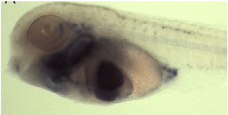 itga8 (integrin, alpha 8 ) gene expression in Xenopus tropicalis embryo via in situ hybridization, NF stage 47, lateral view, anterior left, dorsal up, head and trunk region only. |