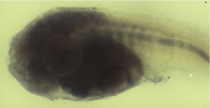 itgb1 (integrin, beta 1) gene expression in Xenopus tropicalis embryo via in situ hybridization, NF stage 45, lateral view, anterior left, dorsal up, head and trunk region only. |