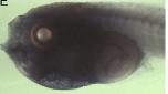 npnt (nephronectin) gene expression in Xenopus tropicalis embryo via in situ hybridization, NF stage 39, lateral view, anterior left, dorsal up. |