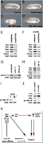 Fig. 4. The role of small RNAs in gene expression. (AâD) Phenotypes of small RNA-injected embryos (stage 30). (A) Control embryo. (BâD) Small RNAs in the range of 20â60 (B), 60â100 (C), and 100â120 (D) bases were injected into dorsal blastomeres of four-cell embryos. (C) Injection of small RNAs (60â100 bases) shortened the dorsal axis in all embryos (n = 56). (E) Injection of small RNAs (60â100 bases) into all blastomeres of four-cell embryos markedly reduced the expression of chordamesodermal genes but increased expression of Xfurry (stage 10). (F) Injection of small RNAs (60â100 bases) into four animal blastomeres of 32-cell embryos in solution containing cycloheximide decreased expression of chordamesodermal genes in the animal caps and slightly reduced the expression of Xfurry (stage 10). (G) Expression of enR+LZ reduced pri-mir-15, and expression of VP16+LZ slightly up-regulated pri-mir-15 in the cycloheximide-treated animal caps (stage 10). (H) Overexpression of mir-15 in the cycloheximide-treated animal caps reduced expression of chordamesodermal genes and did not alter expression of Xfurry. (I) Cycloheximide treatment from stage 7 reduced expression of pri-mir-15 in the treated animal caps (stage 10). (J) Injection of pintallavis-MO (Pint-MO) into all blastomeres of four-cell embryos increased expression of goosecoid and Xnot, did not alter the expression of chordin, and reduced the expression of pri-mir-15 (stage 10). (K) Model of the proposed Xfurry signaling pathway. Xfurry represses expression of mir-15 and microRNAs. Several chordamesodermal genes are repressed by mir-15 and microRNAs. Xfurry also is induced by goosecoid as a downstream gene. Then this feedback loop signaling pathway together with Xfurry regulates expression of chordamesodermal genes. Moreover, low protein levels of several genes activate a system that senses the low-protein condition, thereby inducing Xfurry expression and activating the function of Xfurry as a corepressor. Pin, pintallavis.