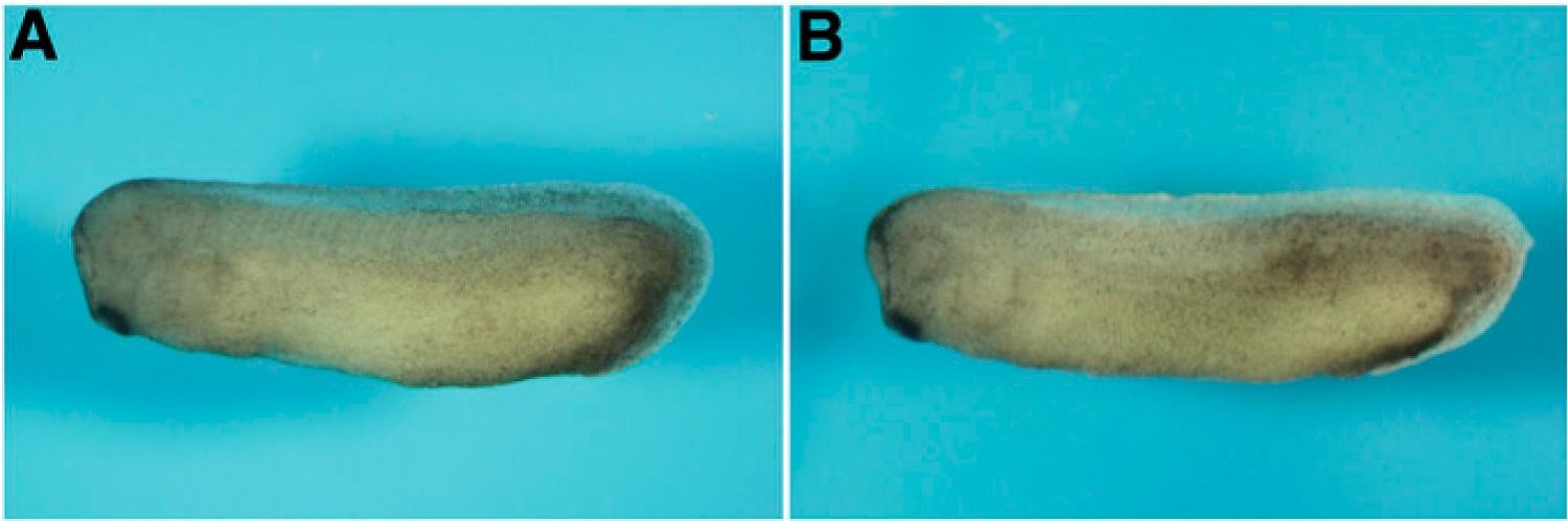 Fig. S2. Dorsal overexpression of Xfurry. (A) Control (stage 28). (B) Injection of Xfurry (2 ng/blastomere) into dorsal blastomeres of four-cell embryos had no effect on axis formation (n = 60).