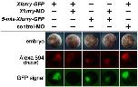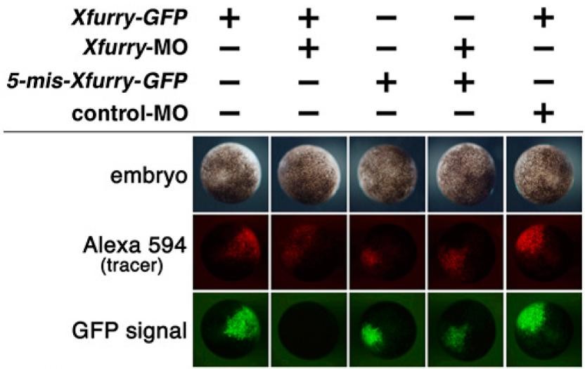 Fig. S3. Confirmation of the morpholino specificity. A tracer, Alexa 594-dextran (300 pg), GFP constructs, and morpholinos were injected in the animal pole of four-cell embryos and were observed at stage 10 to show the injected embryos (Top Row), the fluorescent Alexa 594-dextran tracer (Middle Row), and GFP fluorescence (Bottom Row). Xfurry-MO specifically reduced translation of sequences containing Xfurry-GFP targeted with Xfurry-MO at the 5â²-region but did not reduce translation of 5-mis-Xfurry-GFP, which has no targeted sequence.