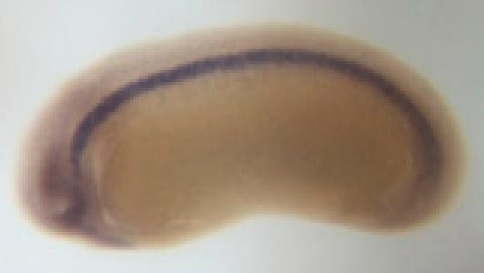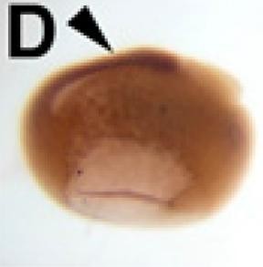 fry (FRYmicrotubule binding protein ) gene expression in bisected Xenopus laevis embryo, mid-sagittal section, assayed via in situ hybridization, NF stage 12, dorsal left, animal pole up.