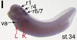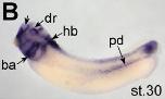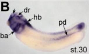 crabp2 () gene expression in X. during organogenesis. In situ hybridisation of crabp2, dark blue stain indicates expression. Stage 30. |