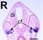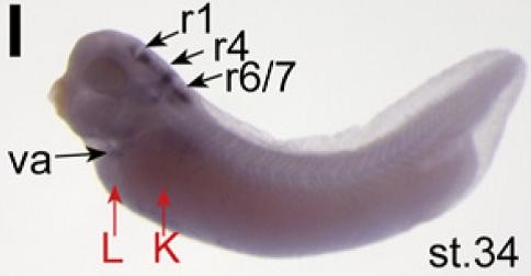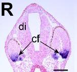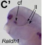 Expression of Raldh1-3 during organogenesis. In situ hybridization of Raldh1-3, dark blue stain indicates expression. Stage 34. di, diencephalon; cf, choroid fissure; dr, dorsal retina; e, endoderm; ey, eye; hb, hindbrain; hy, hypophysis; le, lens; ll, lateral line precursors; lpm, lateral plate mesoderm; m/h, midbrain hindbrain boundary; no, notochord; nt, neural tube; op, olfactory placode; ov, otic vesicle; pk, pronephritic kidney; pd, pronephritic duct; re, retina; rp, roof plate; s, somite; te, telencephalon. Scale bars are 100 μM. |