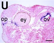 Raldh3 expression in stage 34 embryo, red arrows indicate relative positions of transverse sections in panels RâT. (Qâ) Detail of head of embryo shown in panel Q. Abbreviations: di, diencephalon; cf, choroid fissure; dr, dorsal retina; e, endoderm; ey, eye; hb, hindbrain; hy, hypophysis; le, lens; ll, lateral line precursors; lpm, lateral plate mesoderm; m/h, midbrain hindbrain boundary; no, notochord; nt, neural tube; op, olfactory placode; ov, otic vesicle; pk, pronephritic kidney; pd, pronephritic duct; re, retina; rp, roof plate; s, somite; te, telencephalon. Scale bars are 100 μM. |