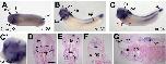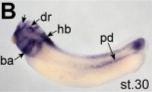 Fig. 3. Expression of Crabp2 during organogenesis. In situ hybridisation of Crabp2, dark blue stain indicates expression. (A) whole mount embryos with anterior to the left and dorsal uppermost. (A) Expression at stage 28. (B) Expression at stage 30. (C) Expression at stage 34. Red arrows indicate positions of transverse sections in panels D. (C Detail of head region of embryo pictured in panel C. (D) Transverse sections through stage 34 embryo. Scale bars are 100 lm. (D) Staining in head mesenchyme ventral to olfactory placodes, at the level of the telencephalon. (E) Staining in branchial arches and dorsal retina at eye level. (F) Staining in the hindbrain is strongest at the lumenal surfaces. (G) Sagittal section though stage 34 embryo showing staining in branchial arches, head mesenchyme, midbrain/hindbrain boundary region and posterior hindbrain. Scale bar is 100 lm. Abbreviations: ba, branchial arches; dr, dorsal retina; hb, hindbrain; hm, head mesenchyme; le, lens; m/h, midbrain hindbrain boundary; no, notochord; op, olfactory placode; ov, otic vesicle; pd, pronephritic duct; s, somite; tb, tailbud; te, telencephalon. |