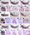 Fig. 1. Expression of Raldh1-3 during organogenesis. In situ hybridisation of Raldh1-3, dark blue stain indicates expression. Panels AâC, HâJ and OâQ are whole mount lateral views with head facing left and dorsal uppermost. Panels Câ, Jâ and Qâ show detail of head area. Panels DâG, KâN and RâU are paraffin sections of previously stained embryos. The blue/purple stain indicates expression and sections are counterstained with eosin (pink). (A) Raldh1 expression at stage 28. (B) Raldh1 expression at stage 30. (C) Raldh1 expression in stage 34, red arrows indicate relative positions of transverse sections in panels D to G. (Câ) Detail of head of embryo shown in panel C. (DâG) Transverse sections of stage 34 embryo showing expression of Raldh1 in blue/purple. (H) Raldh2 expression at stage 28. (I) Raldh2 expression at stage 30. (J) Raldh2 expression at stage 32, red arrows indicate relative positions of transverse sections in panels KâM. (Jâ) Detail of head of embryo shown in panel J. (KâM) Transverse sections through stage 34 embryo showing expression of Raldh2 in dark blue. (N) Sagittal section through eye of a Raldh2 stained embryo at stage 34. (O) Raldh3 expression in stage 26 embryo. (P) Raldh3 expression in stage 30 embryo. (Q) Raldh3 expression in stage 34 embryo, red arrows indicate relative positions of transverse sections in panels RâT. (Qâ) Detail of head of embryo shown in panel Q. (RâT) Transverse sections of stage 34 embryo showing expression of Raldh3 in dark blue. (U) Sagittal section of Raldh3 st. 34 embryo oriented as for whole mounts. Abbreviations: di, diencephalon; cf, choroid fissure; dr, dorsal retina; e, endoderm; ey, eye; hb, hindbrain; hy, hypophysis; le, lens; ll, lateral line precursors; lpm, lateral plate mesoderm; m/h, midbrain hindbrain boundary; no, notochord; nt, neural tube; op, olfactory placode; ov, otic vesicle; pk, pronephritic kidney; pd, pronephritic duct; re, retina; rp, roof plate; s, somite; te, telencephalon. Scale bars are 100 μM. |