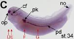 aldh1a1 (aldehyde dehydrogenase 1 family member A1 ) gene expression in Xenopus laevis embryos, NF stage 34, as assayed by in situ hybridization, lateral view, anterior left, dorsal up. (key: op= olfactory placode; cf= choroid fissure; pk= pronephric kidney; pd= pronephric duct; no= posterior notochord) |