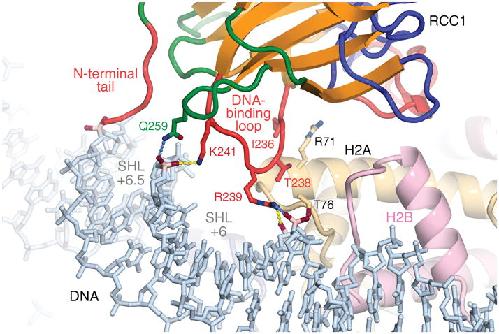 Figure 3. RCC1-nucleosomal DNA interactions. RCC1’s N-terminal tail approaches the DNA minor groove at superhelical location (SHL) 6.5, while its DNA-binding and adjacent loop binds across the major groove at SHL 6. Hydrogen bonds (<3.2 Å) are shown as yellow dotted lines, while potential hydrogen bonds are shown in blue.