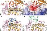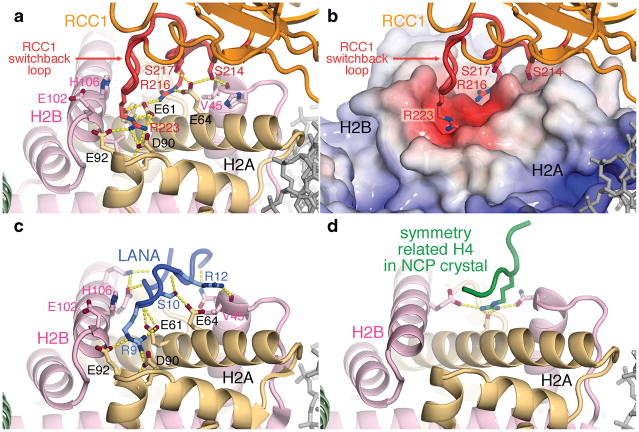 Figure 2. Interactions of RCC1, LANA peptide and H4 peptide with the nucleosome histone dimer acidic patch. (a) RCC1-histone interactions in ribbon representation. RCC1 employs side chains in its switchback loop to bind to the histone dimer. Hydrogen bonds are depicted as yellow dotted lines. (b) RCC1 recognizes acidic histone H2A/H2B dimer surface. APBS49-calculated electrostatics (−3 to +20 kT) were mapped onto histone surfaces using same view as in (a). (c) LANA-histone interactions in LANA-nucleosome crystal structure (PDB id 1ZLA). Key side chains of the LANA peptide (blue) are shown. (d) Histone H4-histone crystal contacts in nucleosome core particle (NCP) crystal structure (PDB id 1KX5).