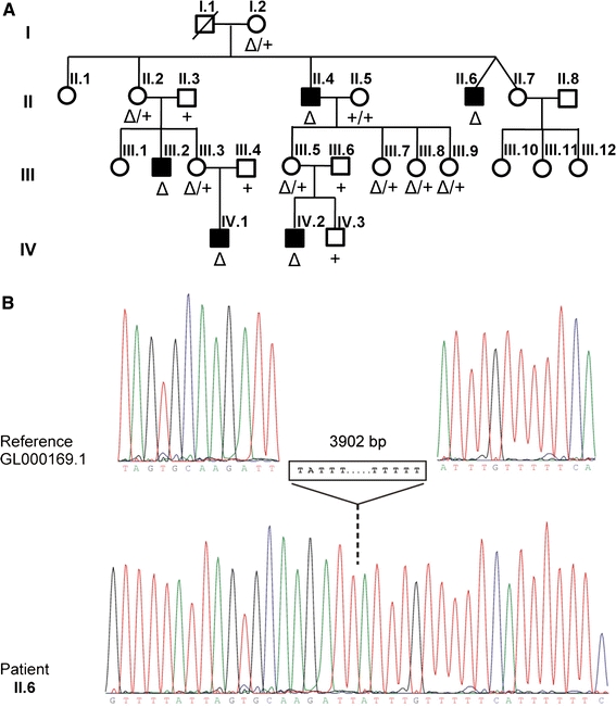 Fig. 4. Genetic analysis of family W06-205. a Pedigree of family W06-205 and segregation of the deletion in the family. Filled squares represent DFN3 males. δ deletion, + wildtype. The genotype of females who are not obligate carriers has not been indicated for privacy reasons. b Sequence chromatogram showing the deletion breakpoints in patient II.6. Above this chromatogram, the deletion is schematically indicated